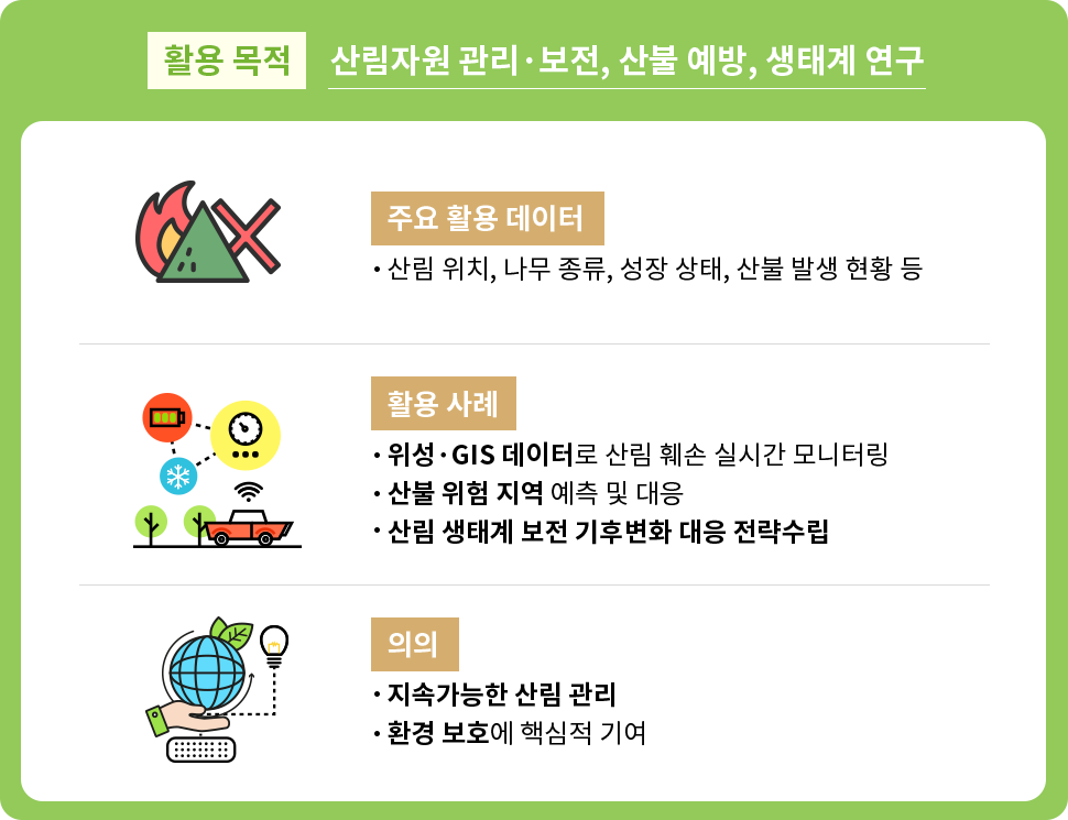 산림자원 관리와 보전, 산불 예방, 산림 생태계 연구 등에 광범위하게